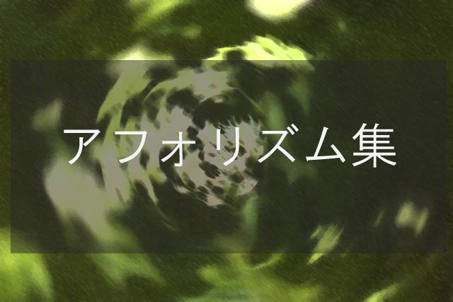 アフォリズム集 学問 2024年12月26日 0 アフォリズム 箴言、警句。 アフォリズム集 アフォリズムとは、簡潔にまとめた言葉、短い文章。 哲学、仏教、心理 アフォリズム。倫理・道徳 アフォリズム。 宗教 アフォリズム。社会、経済 アフォリズム。 アフォリズム(aphorism)